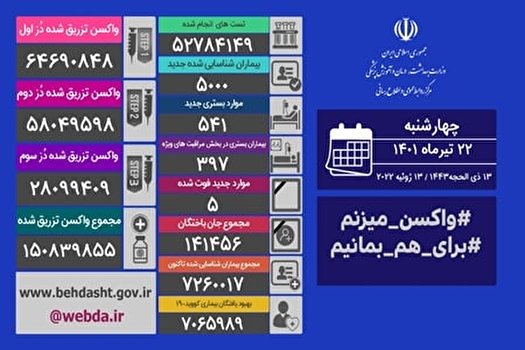 از دیروز تا امروز ۲۲ تیرماه ۱۴۰۱ و بر اساس معیارهای قطعی تشخیصی، ۵۰۰۰ بیمار جدید مبتلا به کووید۱۹ در کشور شناسایی و ۵۴۱ نفر از آنها بستری شدند.