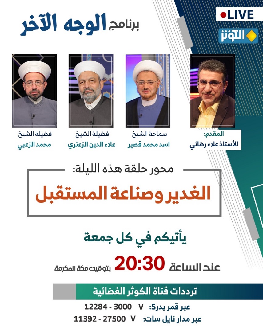 در برنامه امشب که به موضوع «غدیر و آینده سازی» اختصاص دارد استادان بزرگ شیخ اسد محمد قصیر، شیخ علاء الدین الزعتری، و شیخ محمد الزعبی به عنوان صاحبنظر حضور دارند و اجرای برنامه نیز برعهده استاد علاء رضایی است.
