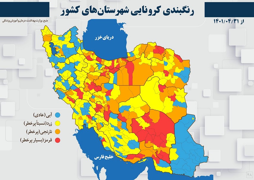 به گزارش پایگاه شبکه الکوثر، مرکز روابط عمومی و اطلاع رسانی وزارت بهداشت درباره آخرین رنگبندی کرونایی کشور اعلام کرد در حال حاضر ۵۷ شهر در وضعیت قرمز، ۸۶ شهر در وضعیت نارنجی، ۱۹۹ شهر در وضعیت زرد و ۱۰۶ شهر در وضعیت آبی است.