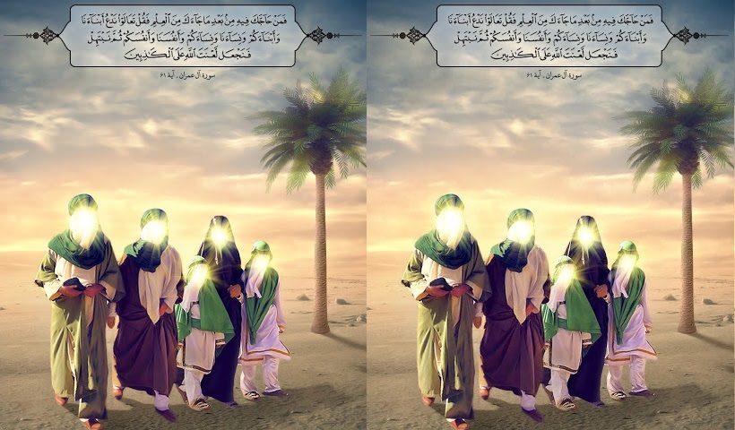 «هر گاه (مسیحیان) بعد از علم و دانشی که به تو رسیده (درباره نفی الوهیت مسیح(علیه السلام) و تثلیت و انحرافاتی از این قبیل) با تو به بحث و ستیز برخیزند، به آنها بگو: "ما فرزندان خود را دعوت کنیم شما نیز فرزندان خود را (فَمَن حاجَّکَ فیهِ مَن بَعدِ ما جائَکَ مِنَ العِلمِ فَقُل تَعالَوا نَدْعُ اَبنائَنا وَ اَبنائَکُم) ، ما زنان خویش را دعوت نماییم و شما نیز زنان خود را، (وَ نِسائَنا وَ نِسائَکُمْ)، ما از نفوس خود (و کسی که همچون جان ما است) دعوت مینماییم و شما نیز نفوس خود ( وَ اَنفُسَنا وَ اَنفُسَکُمْ).