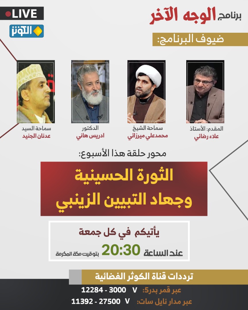 به گزارش پایگاه شبکه الکوثر، برنامه «الوجه الآخر» که با حضور علما و اندیشمندان و صاحبنظران از مکاتب مختلف فکری و عقیدتی تهیه می شود، این هفته «قیام عاشورا» را محور بحث خود قرار داده است .