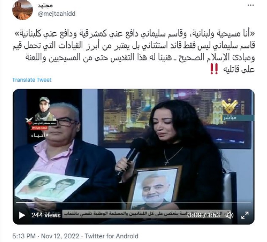 به گزارش پایگاه شبکه الکوثر، صفحه «مجتهد» در توئیتر که علیه حاکمیت سعودی فعالیت دارد و معمولا اسراری از داخل خاندان حاکم بر عربستان را منتشر می کند، اظهارات یک بانوی مسیحی لبنانی را در ستایش سردار قاسم سلیمانی منتشر کرد که بسیار مورد توجه قرار گرفت.
