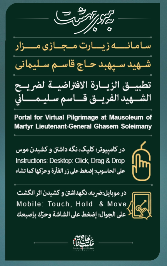 به گزارش پایگاه شبکه الکوثر، علاقه مندان به زیارت مجزای مزار مطهر سردار فاطمی و علوی شهید حاج قاسم سلیمانی و سایر شهدای گلزار کرمان از طریق لینک https://soleimani.ir/tour وارد تور مجازی گلزار شهدای کرمان شوند.
