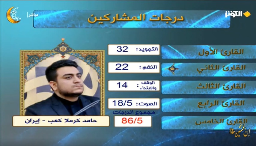 ویژه - الکوثر : درسومین شب مسابقات بین المللی قرآنی «ان للمتقین مفازا»، مصطفی مبارک محسنی از افغانستان، حمید کرمله کعب از ایران،. امجد فلیح حسن الحاجیم و رسول العامری هر دو از عراق حضور داشتند.