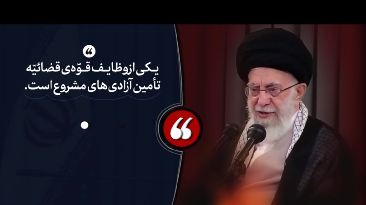 حضرت آیتالله خامنهای: «یکی از وظایف قوّهی قضائیّه تأمین آزادیهای مشروع است. خیلی دقیق نوشتهاند؛ آزادی مطلق نیست، آزادی مشروع. آزادی مشروع همان است که شرع اجازه میدهد. قانون اساسی این است. در ذیل حکم شرع، آزادیهای مردم باید تأمین بشود. خب، دستگاههای قدرت به طور طبیعی در یک مواردی دچار معارضه میشوند؛ چه کسی باید در این زمینه به داد مردم برسد؟ قوّهی قضائیّه؛ یعنی یکی از کارهای مهمّ قوّهی قضائیّه همین است».