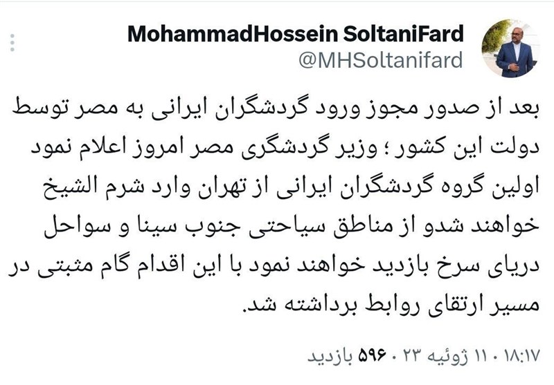 محمدحسین سلطانی فر رئیس دفتر حافظ منافع ایران در قاهره در صفحه توئیتر خود نوشت: بعد از صدور مجوز ورود گردشگران ایرانی به مصر توسط دولت این کشور؛ وزیر گردشگری مصر امروز اعلام نمود اولین گروه گردشگران ایرانی از تهران وارد شرم الشیخ خواهند شدو از مناطق سیاحتی جنوب سینا و سواحل دریای سرخ بازدید خواهند نمود با این اقدام گام مثبتی در مسیر ارتقای روابط برداشته شد.