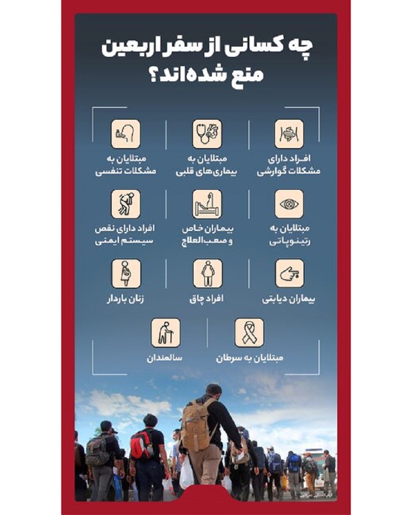 بنابر مصوبه ستاد مرکزی اربعین با توجه به شرایط خاص گرمای هوا، پیادهروی اربعین برای برخی بیماران ممنوع است. اینفوگرافیک زیر فهرست بیماریهایی است که مبتلایان آنها از سفر به اربعین منع شدهاند.