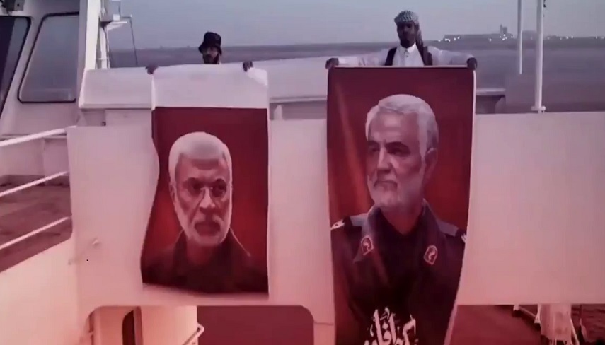 یمنیها تصویر سردار سلیمانی را روی عرشه ی کشتی توقیف شده به اهتزاز درآوردند.