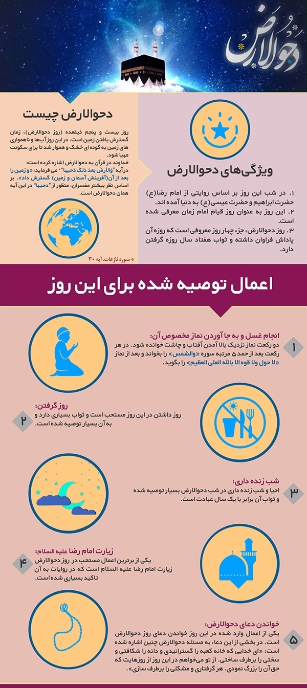به گزارش پایگاه شبکه الکوثر، فردا دوشنبه ۱۴ خردادماه مصادف با ۲۵ ذیالقعده روز دحوالارض است. دحوالارض به معنای گستراندن زمین یا وسعت یافتن خشکی است. خداوند متعال در آیه ۳۰ سوره نازعات در خصوص نحوه به وجود آمدن خشکیها فرموده است: «وَالْأَرْضَ بَعْدَ ذَلِكَ دَحَاهَا؛ و پس از آن زمين را با غلتانيدن گسترد». در این روز با نظر رحمت الهی به زمین، خشکی از زیر نقطهای که اکنون خانه کعبه در آن واقع شده است، گسترش پیدا کرد در حالی که قبل از آن تمام سطح زمین پوشیده از آب بود.