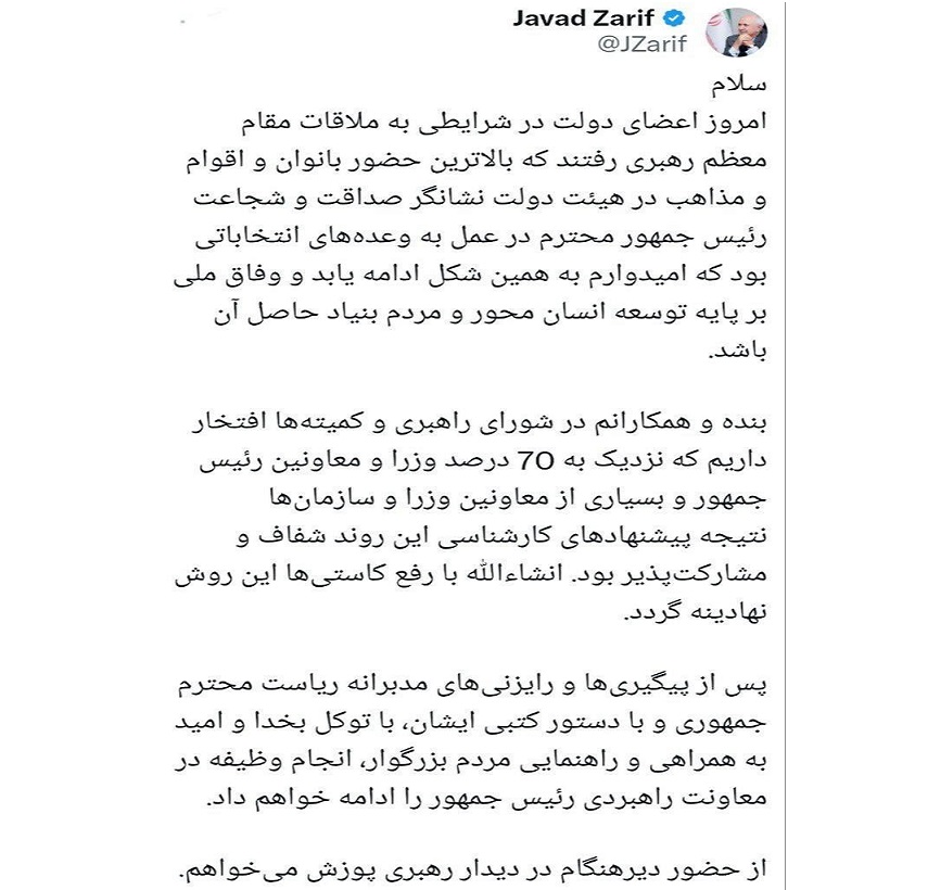 «امروز اعضای دولت در شرایطی به ملاقات مقام معظم رهبری رفتند که بالاترین حضور بانوان و اقوام و مذاهب در هیئت دولت نشانگر صداقت و شجاعت رئیس جمهور محترم در عمل به وعدههای انتخاباتی بود که امیدوارم به همین شکل ادامه یابد و وفاق ملی بر پایه توسعه انسان محور و مردم بنیاد حاصل آن باشد.