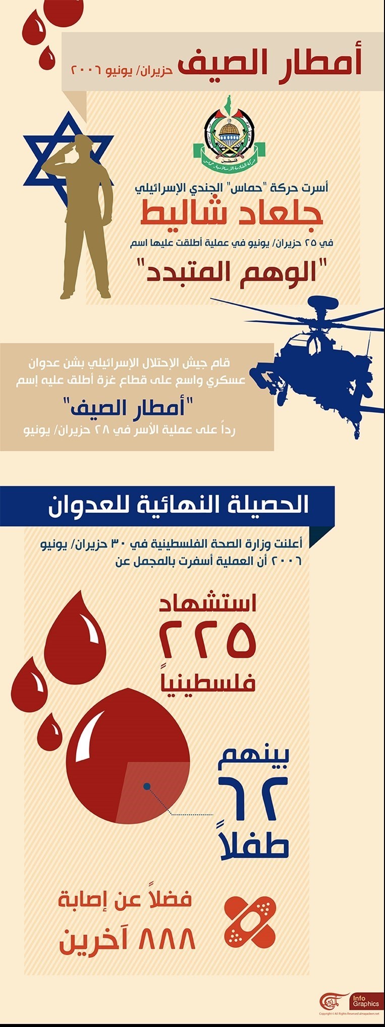 جنبش حماس در علمیات معروف به «توهم بر باد رفته» 25 ژوئن گلعاد شالیت سرباز اسرائیلی را به اسارت گرفت، نیروهای ارتش اسرائیل در واکنش به این اقدام در عملیات گسترده نظامی تحت عنوان «باران های تابستان» در 28 ژوئن غزه را هدف حمله قرار دادند.
