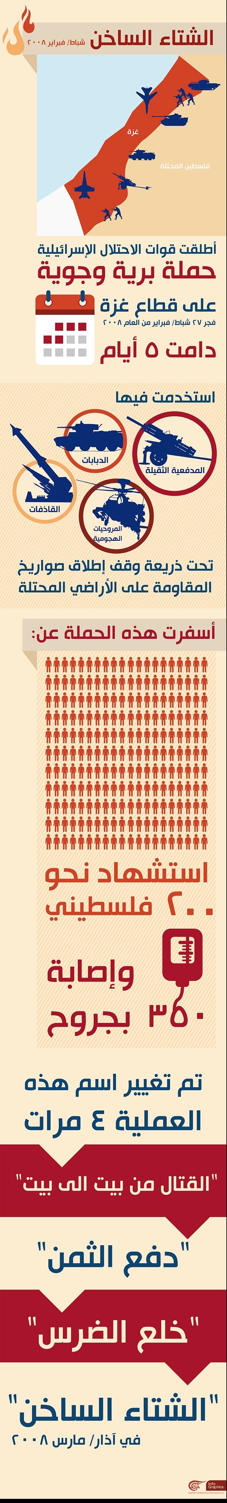 در این حمله نیروهای اسرائیلی در 27 فوریه 2008 به بهانه متوقف کردن حملات موشکی مقاومت به فلسطین اشغالی در جنگی پنج روزه غزه را از زمین و هوا مورد تهاجم قرار دادند و در جریان آن از توپخانه سنگین، تانها و بالگردهی هجومی و راکت استفاده کردند. در این تجاوز 200 تن شهید و 350 نفر نیز زخمی شدند.جالب اینکه نام این عملیات چهار بار تغییر داده شد به این ترتیب که نخست «نبرد خانه به خانه» نامیده شده و سپس «پرداختن هزینه» نام گرفته و بار دیگر به « کشیدن دندان» تغییر داده شد و در نهایت زمستان داغ نام گرفت.