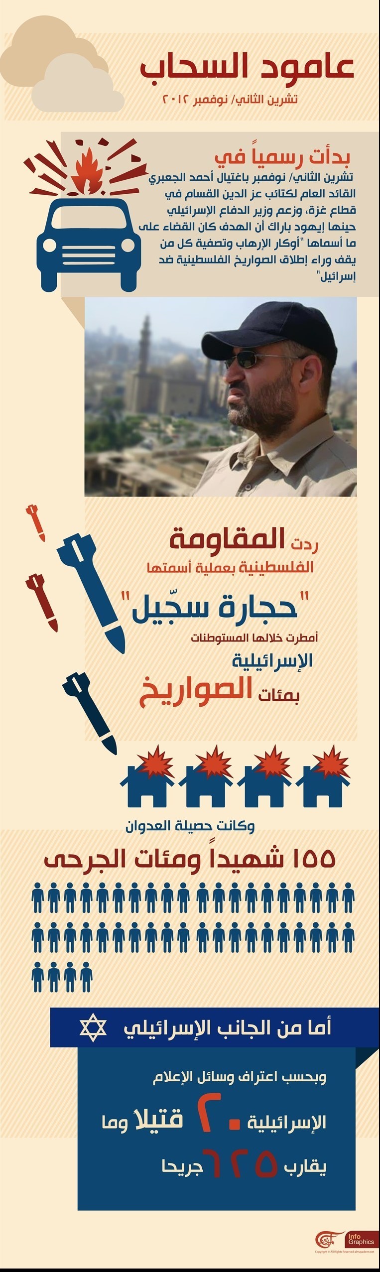 عملیات ستون ابر در نوامبر 2012 با ترور احمد الجعبری فرمانده کل گردانهای عزالدین قسام در غزه کلید خورد. در آن زمان ایهود باراک وزیر جنگ وقت اسرائیل مدعی شد که هدف از این حمله نابودی کانون های تروریسم و از بین بردن تمام کسانی است که در شلیک موشک های فلسطینی علیه اسرائیل دست دارند. این حمله 155 شهید و صدها مجروح بر جا گذاشت و اسرائیل نیز به کشته شدن 20 نفر از نیروهای خود و مجروح شدن حدود 625 اسرائیلی اعتراف کرد.