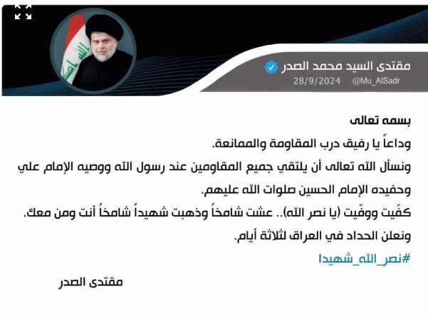 مقتدی صدر نوشت: از خداوند میخواهم با سایر شهدای مقاومت در جوار پیامبر (ص)، امام علی (ع) و امام حسین (ع) دیدار کند. او عزتمندانه زندگی کرد و سربلند به شهادت رسید.
