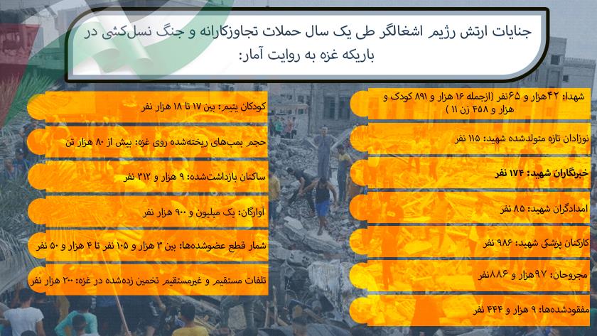 آمار جنایات رژیم صهیونیستی در نوار غزه طی را یک سال گذشته در اینفوگراف مشاهده می کنید: