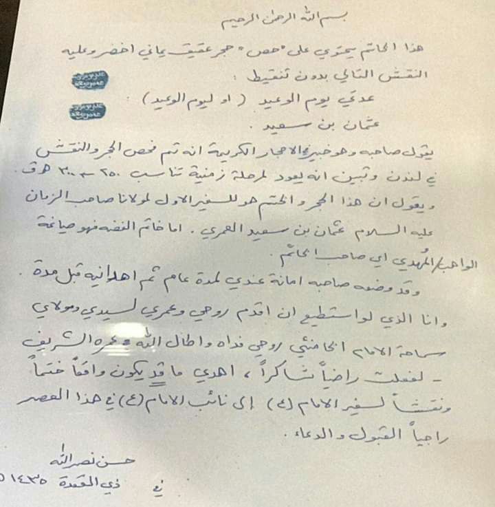 عثمان بن سعید، صاحب این انگشتر که متخصص سنگهای زینتی است می گوید سنگ و نوشته آن در لندن مورد آزمایش قرار گرفت و مشخص شد به مرحله تاریخی ای باز می گردد که بین ۲۵۰ تا ۳۰۰ هجری قمری است و می گوید این سنگ و انگشتر مربوط به سفیر اول مولای ما صاحب الزمان علیه السلام یعنی عثمان بن سعید العمری است. اما سازنده انگشتر نقره کسی است که سنگ به او هدیه شده یا اهدا کننده آن یعنی صاحب انگشتر.