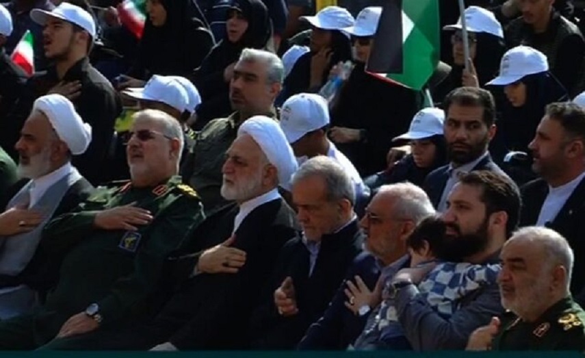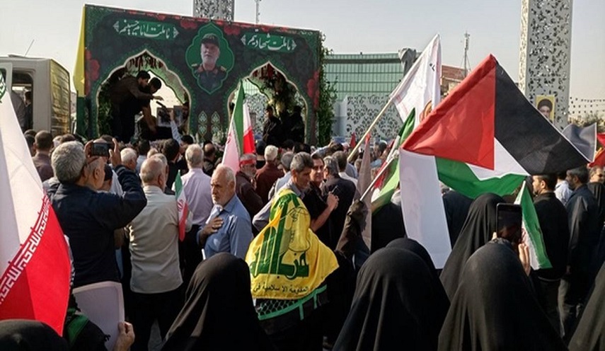 حاضرین در مراسم با در دست داشتن پرچم حزب الله لبنان و فلسطین، شعارهای مرگ بر آمریکا و اسرائیل سر دادند.