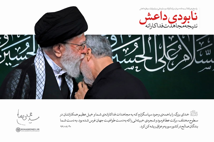 حضرت آیتالله خامنهای نیز در پاسخ به نامهی سردار سرلشکر پاسدار حاج قاسم سلیمانی فرمانده نیروی قدس سپاه پاسداران انقلاب اسلامی دربارهی پایان سیطرهی شجرهی خبیثهی داعش تأکید کردند: شما با متلاشی ساختن تودهی سرطانی و مهلک داعش نهفقط به کشورهای منطقه و به جهان اسلام بلکه به همهی ملتها و به بشریت خدمتی بزرگ کردید.
