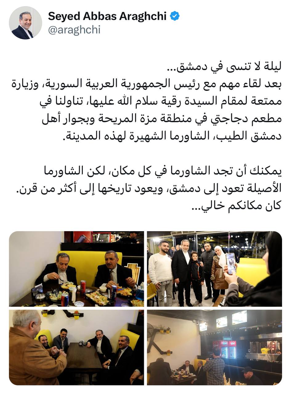 به گزارش پایگاه شبکه الکوثر، سید عباس عراقچی، وزیر امور خارجه کشورمان با توصیف حضور خود در سوریه به عنوان «شبی بیاد ماندنی در دمشق»، در حساب رسمی خود در برنامه ایکس نوشت: بعد از دیداری مهم با رئیس جمهور سوریه، و زیارت دلچسب حرم حضرت رقیه (س)، در رستوران دجاجتی در منطقه دنج مزه در کنار مردم خونگرم دمشق شاورمای معروف این شهر را خوردیم.