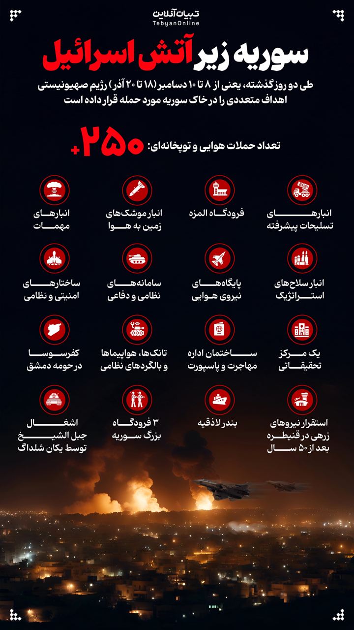 طی دو روز گذشته، یعنی از ۸ تا ۱۰ دسامبر (۱۸ تا ۲۰ آبان) رژیم صهیونیستی اهداف متعددی را در خاک سوریه مورد حمله قرار داده است.