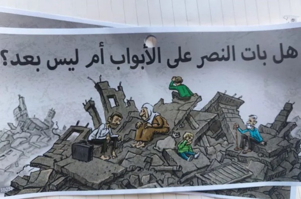 ارتش اسرائیل در این تصاویر که در آن زنان، مردان، سالخوردگان و کودکان فلسطینی روی خانههای ویران شده خود در بمباران اسرائیل نشستهاند، با لحنی تمسخرآمیز و سرزنشکننده، خطاب به مردم صبور و مقاوم غزه نوشته است، «پیروزی نزدیک است یا هنوز از راه نرسیده است؟»؛ «پیروزی دیگری برای مقاومت».