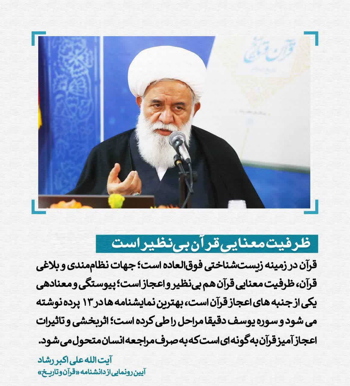 رشاد با بیان اینکه جلدهای سوم و چهارم با موضوع قرآن و ادیان در حال تدوین است، افزود: قرآن کریم در شرایطی نازل شد که در همه جزیره العرب ۲۳ نفر فقط سواد خواندن و نوشتن داشتند و چنین کتابی واقعا اعجاز است؛ قرآنی که در حوزه پزشکی نکات فوقالعاده شگفتآوری دارد.