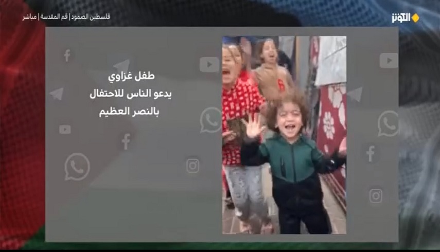 پس از انتشار اخبار پایان جنگ وعقب نشینی تانک های رژیم صهیونیستی از شمال غزه، تعدادی از ساکنان غزه به خانه های خود بازگشتند. اما آنها با ویرانی های گسترده ای مواجه شدند . یک کودک خردسال غزه ای درحالی که از شادی و خوشحالی در پوست خود نمی گنجد، از همه می خواهد پیروزی غزه را جشن بگیرند.