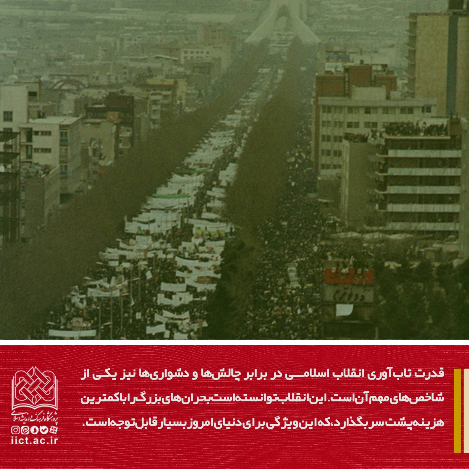 قدرت تابآوری انقلاب اسلامی در برابر چالشها و دشواریها نیز یکی از شاخصهای مهم آن است. این انقلاب توانسته است بحرانهای بزرگ را با کمترین هزینه پشت سر بگذارد، که این ویژگی برای دنیای امروز بسیار قابل توجه است.
