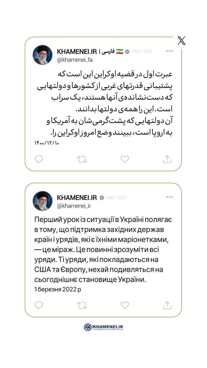 عبرت اول در قضیه اوکراین این است که پشتیبانی قدرتهای غربی از کشورها و دولتهایی که دستنشاندهی آنها هستند، یک سراب است. این را همهی دولتها بدانند. آن دولتهایی که پشتگرمیشان به آمریکا و به اروپا است، ببینند وضع امروز اوکراین را.