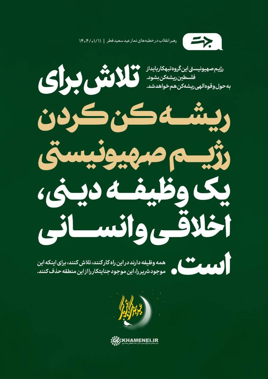 رهبر معظم انقلاب اسلامی در خطبههای نماز عید سعید فطر، با اشاره به جنایات رژیم صهیونیستی، این گروه تبهکار را تهدیدی برای امنیت و عدالت در منطقه دانستند و تأکید کردند که ریشهکن کردن این رژیم، وظیفهای دینی، اخلاقی و انسانی است. ایشان با اطمینان از تحقق این هدف به حول و قوه الهی، خواستار تلاش همهجانبه امت اسلامی برای حذف این موجود شریر و جنایتکار شدند.