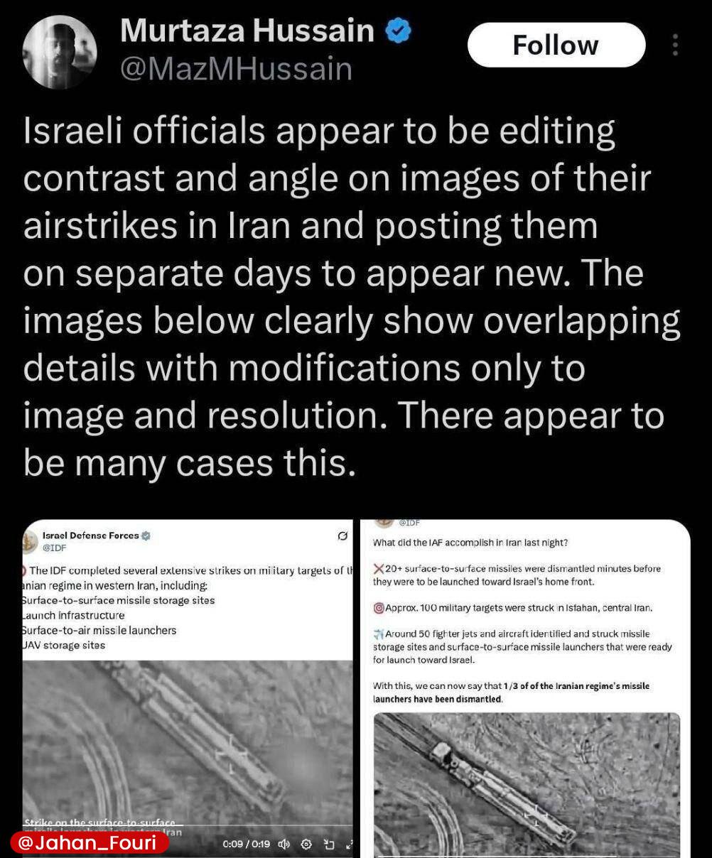 «مرتضی حسین» خبرنگار نشریه آمریکایی «اینترسپت» در صفحه توئیتر خود فاش کرد: به نظر میرسد اسرائیلیها از تصاویر آرشیوی و قدیمی برای نمایش حملات اخیر خود به ایران استفاده میکنند.