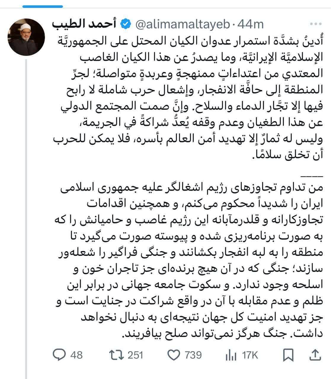 در بیانیه احمد الطیب شیخ الازهر آمده است که رژیم صهیونیستی به دنبال ایجاد جنگ فراگیر در منطقه است که غیر از تاجران خون و سلاح، کسی برنده این جنگ نخواهد بود.