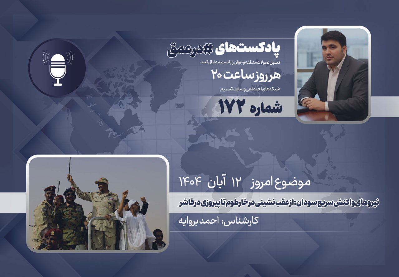 در یکصدوهفتادودومین شماره از پادکست «در عمق» به بررسی مهمترین روندها، تحولات و همچنین شخصیتها در غرب آسیا میپردازد، «احمد بروایه»، کارشناس مسائل مصر و شمال آفریقا، تحولات روزهای اخیر سودان و جنایتهای نیروهای واکنش سریع پس از تسلط بر شهر فاشر را از نظر گذرانده است.