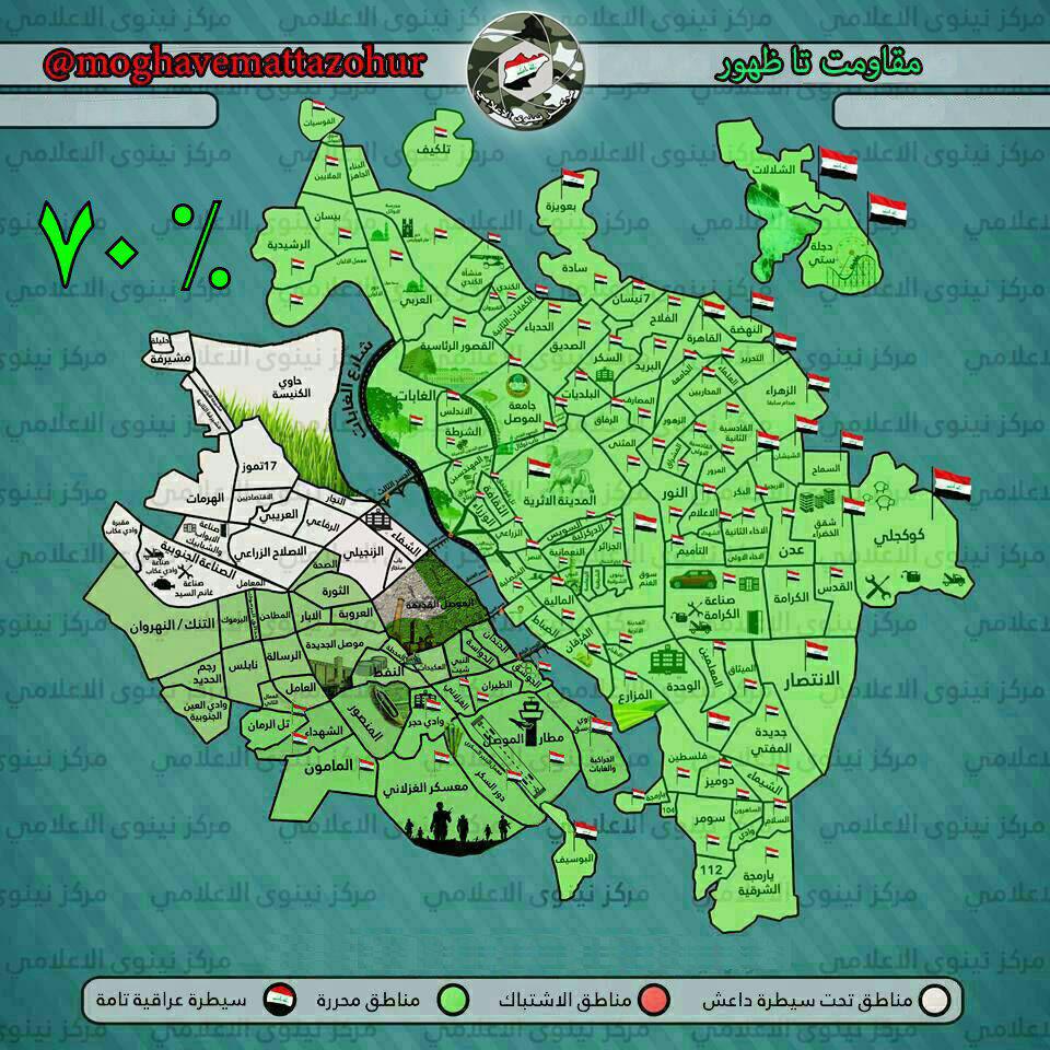 پلیس فدرال عراق، ونیروی واکنش سریع عراق به همراه نیروهای ضد تروریست عراق تاکنون 70 درصد از ساحل غربی موصل را آزاد کرده و پیشروی برای آزادسازی مناطق تحت تسلط داعش همچنان ادامه دارد.