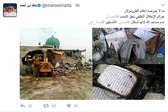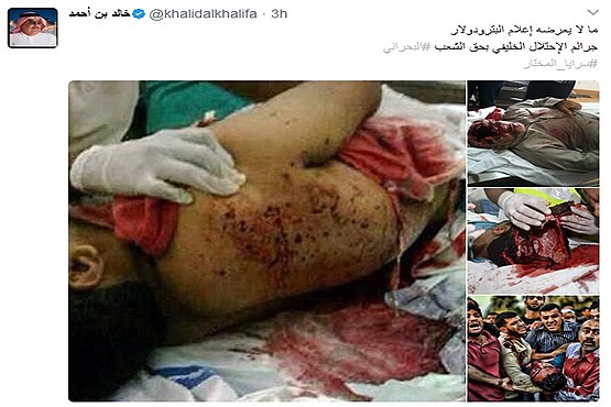هکر توئیتر رسمی خالد بن احمد خلیفه از طرف وی در توئیتر پست می گذارد، پست هایی که مربوط به قتل عام شیعیان بحرین از سوی رژیم آل سعود و آثار به جای مانده از جنگ را نشان می دهد.