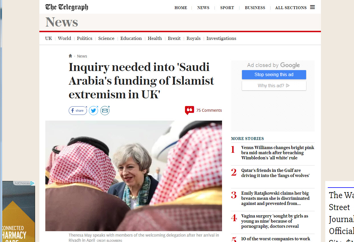 بر اساس این گزارش که در نشریه «نیوز ویک» منتشر شد، یک تشکل انگلیسی در گزارشی اعلام کرد که عربستان سعودی بزرگترین حامی و ترویجدهنده تندروی و افراطگرایی در انگلیس است و در این خصوص طی پنجاه سال گذشته، ۸۷ میلیارد دلار برای صدور وهابیت در جهان اسلام هزینه کرده است.