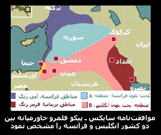 بالأخره، دولت عثمانی فرو پاشید و فاتحان جنگ یعنی فرانسه و بریتانیا منطقه را بین خود تقسیم کردند. اینان به جای تشکیل دولت پادشاهی عربی، منطقه را بین خود تقسیم کردند. این تقسیم به سایکس پیکو معروف است. این نقشۀ محرمانه از طرف سایکس، وزیر امور خارجۀ بریتانیا، و پیکو، وزیر امور خارجه فرانسه، طراحی شد. بخشی از ترکیۀ امروز، بخشی از سوریه و کل لبنان تحت مدیریت مستقیم فرانسه قرار گرفت. دو منطقۀ عربی تشکیل شد. منطقه عربی A و منطقه عربی B. منطقۀ عربی A شامل دمشق و حلب و موصل به فیصل، حسین بن علی پسر بزرگ شریف مکه سپرده شد. عبدالاله پسر دیگر شریف مکه، به پادشاهی منطقه B شامل عراق، کویت، بصره و ساحل شمالی خلیج فارس انتخاب شد. این اتفاق به سبب اعتبارات و ملاحظات کشتیرانی و تجارت است. فلسطین را هم تحتالحمایة نگه داشتند و به کسی ندادند. چون طرح این است که در اینجا اسرائیل درست کنند و منطقه را به یهودیها بدهند و صهیونیستها را بیاورند. این نقشه بسیار اهمیت دارد و در آن اولین تقسیمات سایکس پیکو نمایش داده شده است.