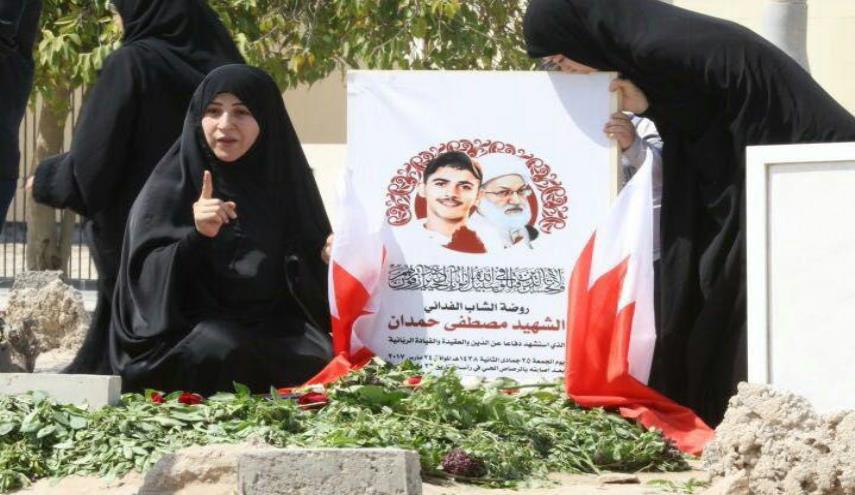 بشعار “كلنا فداك” ضمن صورة تجمع الشهيد مصطفى وآية الله قاسم وصلت أم الشهيد الى قبر ابنها الشهيد مصطفى في مراسم ختام التأبين، تأبين خرج عن المألوف كعادة البحرينيين، وتحسبا لمنع السلطات فقد جرت مراسم ختام تأبين الشهيد صباحاً وبحضور شخصيات ونشطاء وآباء الشهداء.