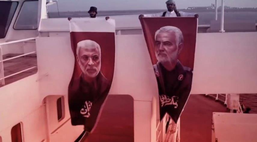 أعاد الناشطون في مواقع التواصل الإجتماعي مقطع فيديو يظهر سطح السفن التي استولى عليها اليمنيون وقاموا بتزئين سطح السفينة بصور قادة النصر، شهيدي المقاومة "الحاج قاسم سليماني وأبو مهدي المهندس".
