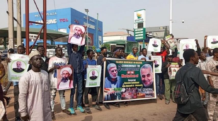 نظم اعضاء الحركة الاسلامية في نيجيريا ، مسيرة في الذكرى الثالثة لاستشهاد "قادة النصر" الشهيد الفريق قاسم سليماني قائد قوة القدس بالحرس الثوري و الشهيد ابومهدي المهندس نائب رئيس هيئة الحشد الشعبي، قاموا خلالها باحراق العلم الاميركي.