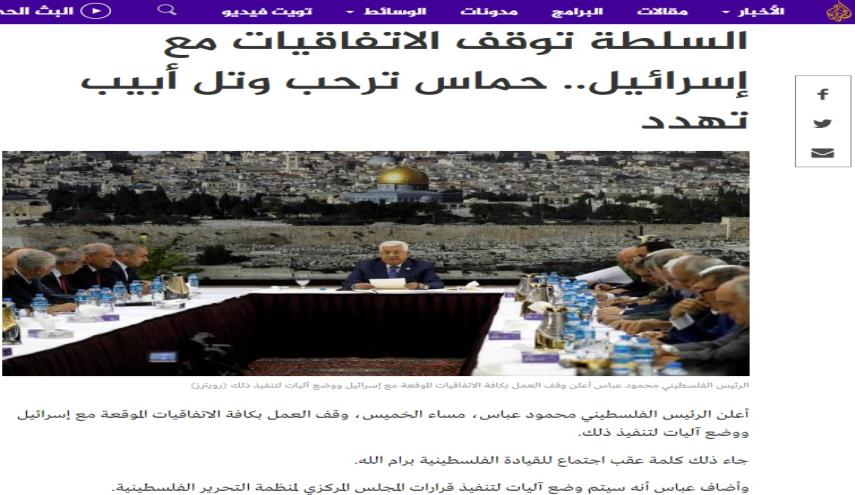 الكوثر: تناول موقع قناة الجزيرة بتفصيل قرار عباس بوقف تنفيذ الاتفاقيات مع الاحتلال وذكر بان اسرائيل هددت أن يدفع الشعب الفلسطيني ثمن هذا القرار باهضا الثمن.
