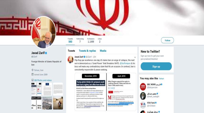 ايران - الكوثر: رد وزير الخارجية الايراني محمد جواد ظريف على تصريحات نظيره الامريكي مايك بومبيو الاخيرة والتي زعم فيها ان الحكومة الإيرانية على وشك الانهيار وانها تمثل تهديدا رئيسيا لحلف الناتو.