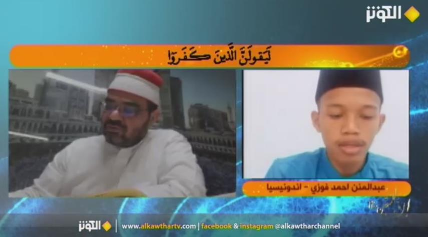 إن للمتقين مفازا– الكوثر: تلاوة قرآنية من المتسابق المشارك من أندونیسیا " عبدالمنن أحمد فوزي " حسب القرعة من سورة المائدة المبارکة في الليلة الثامنة والعشرین من مسابقة "إن للمتقين مفازا" الدورة الرابعة عشرة لشهر رمضان 2021.