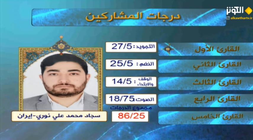 تلاوة قرآنية للمتسابق المشارك من ايران "سجاد محمدعلي نوري" حسب القرعة من سورة العنكبوت المباركة في الليلة الرابعة والعشرين من مسابقة "إن للمتقين مفازا" الدورة السادسة عشرة لشهر رمضان 2023.