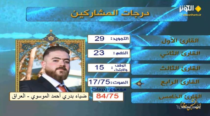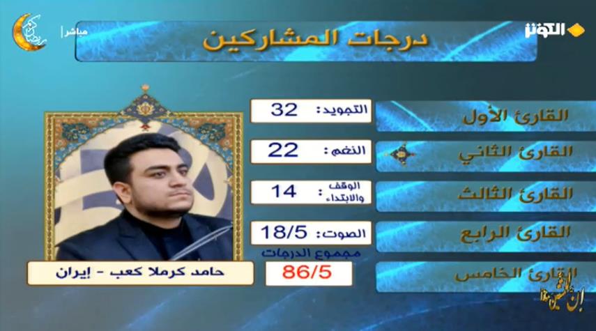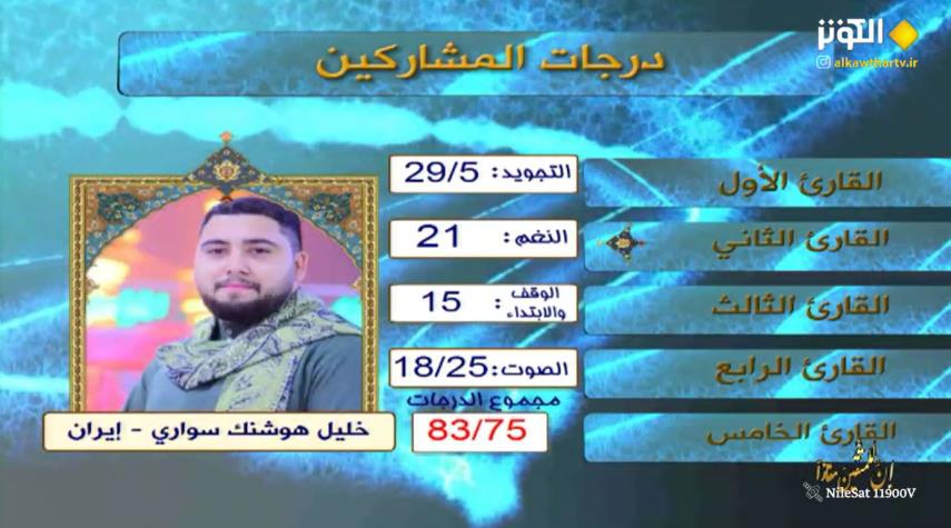 شارك في الليلة الخامسة من مسابقة "إن للمتقين مفازا" الدورة السادسة عشرة لشهر رمضان 2023 كل من المتسابقين: القارئ آية الله احمد شوري من اندونيسيا ،القارئ خليل هوشنك سواري من الجمهورية الاسلامي الايرانية ، القارئ براق منير بشير من العراق ، القارئ محمد ابراهيم محمد من مصر.
