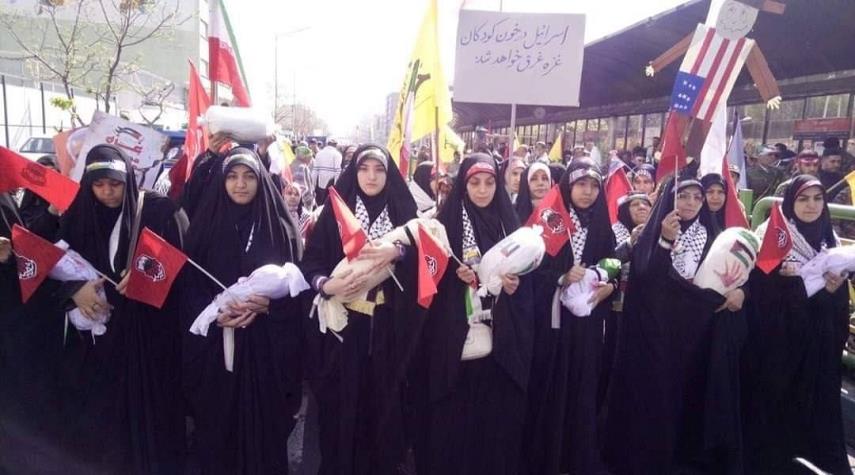 شاهد..نساء إيرانيات يحملن أجساداً رمزية للشهداء الأطفال في غزة خلال مسيرات يوم القدس العالمي في طهران