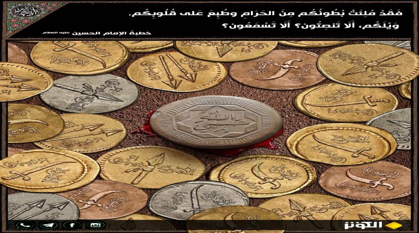 بوسترات - الكوثر: قال الإمام الحسين عليه السلام في خطبة شهيرة له وتعد مدرسة وعاض للبشرية "ملئت بطونكم من الحرام وطبع على قلوبكم ويلكم، ألا تنصتون؟! ألا تسمعون؟!
