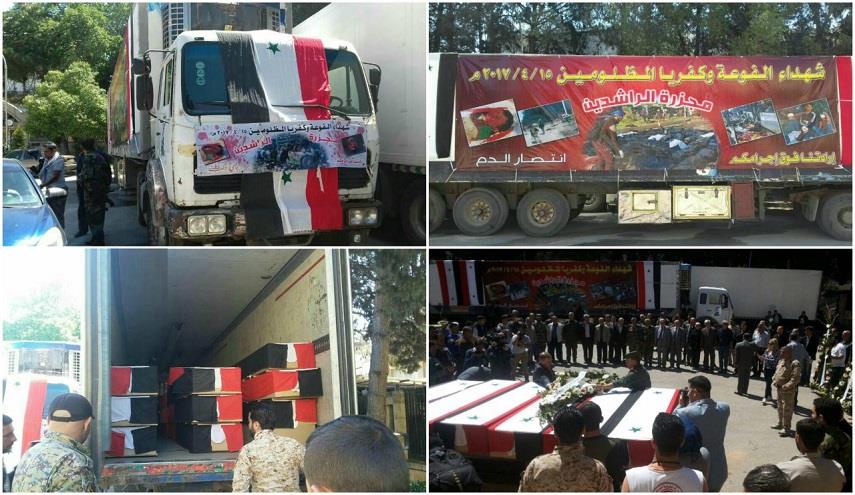 شيعت قافلة جثامين الشهداء من الفوعة وكفريا في دمشق حيث استشهدوا في مجزرة الراشدين الأسبوع الماضي بحلب ليتم دفنهما في منطقة الزينبية.