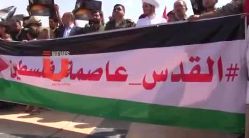 شاهد .. سوريا: مواطنو حلب واللاجئون الفلسطينيون المقيمون فيها يحيون يوم القدس العالمي بتجمع جماهيري