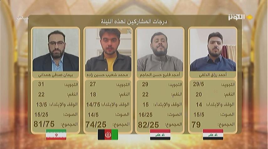 تلاوة قرآنية للمتسابق المشارك " ضرغام جهادي خضير " من العراق حسب القرعة في الليلة الحادية والعشرين من مسابقة "إن للمتقين مفازا" من آية 59 الى 62 من الإسراء المباركة.